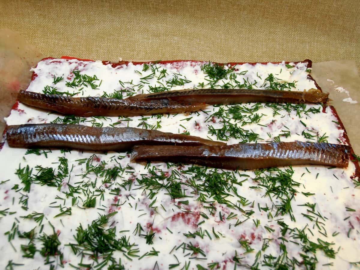 9. Підготовлені шматочки оселедця викладаємо в два рівня. Яку рибу ви використовуєте в закусках? Пишіть в коментарях!