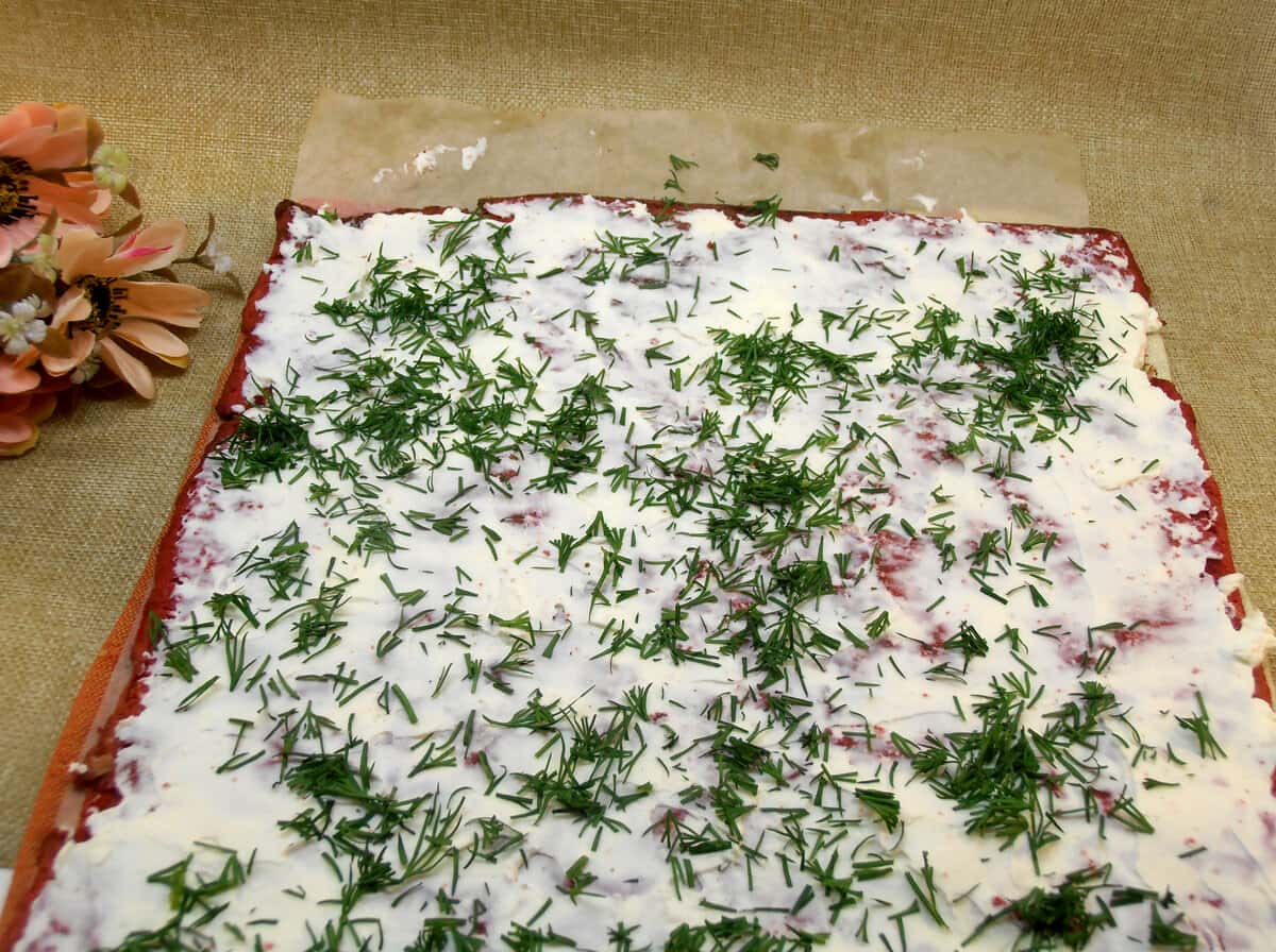 7. На бісквіт викладаємо вершковий домашній сир і розділимо його рівномірно по всьому периметру. Зелень кропу дрібно нарізаємо і посипаємо рясно весь пласт.