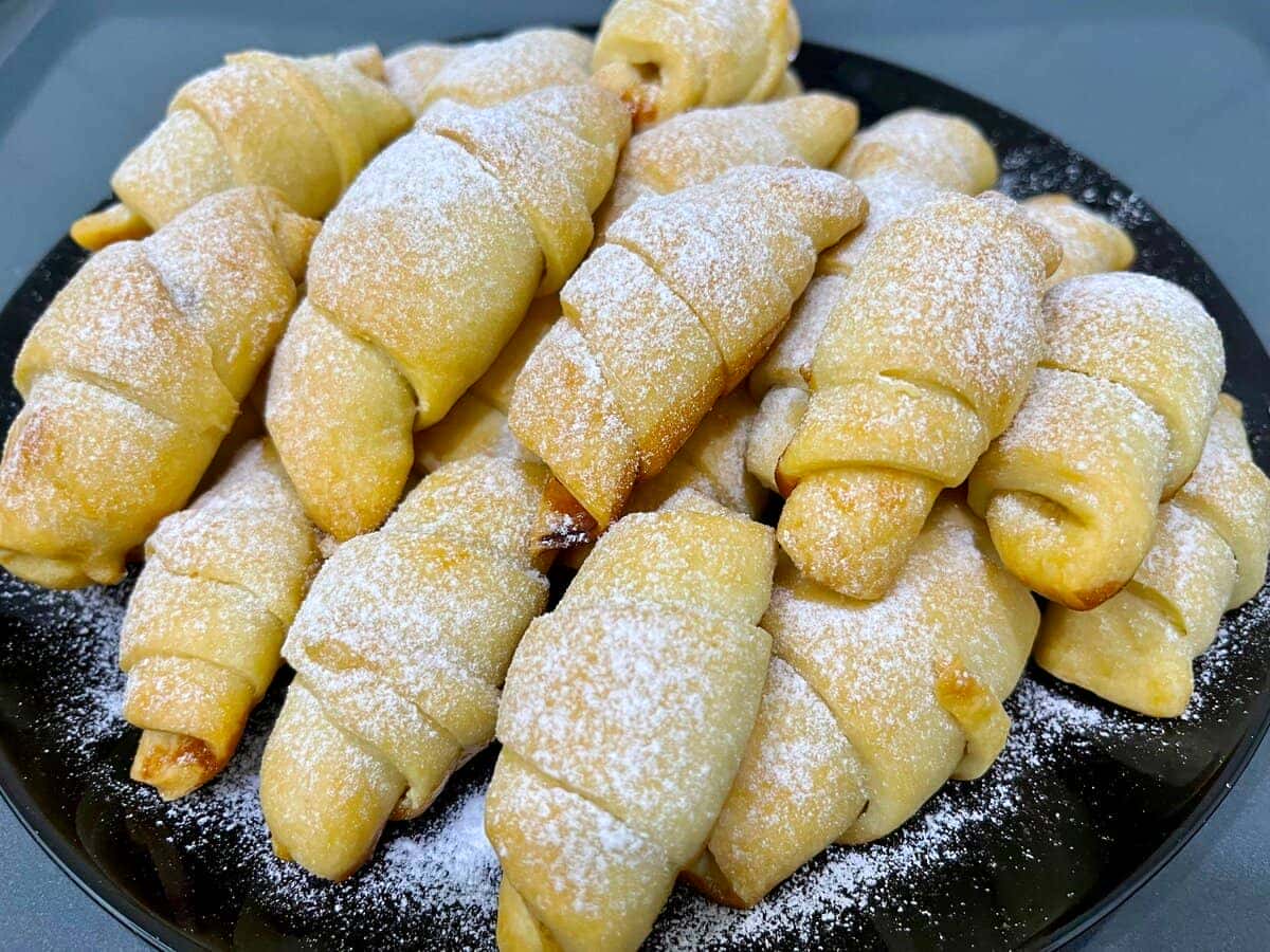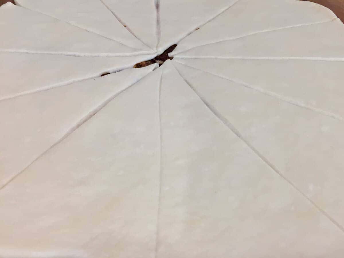 Ділимо тісто на дві частини і кожну розкачуємо в тонке коло. Розрізаємо на однакові сегменти ( приблизно 12 штук ).