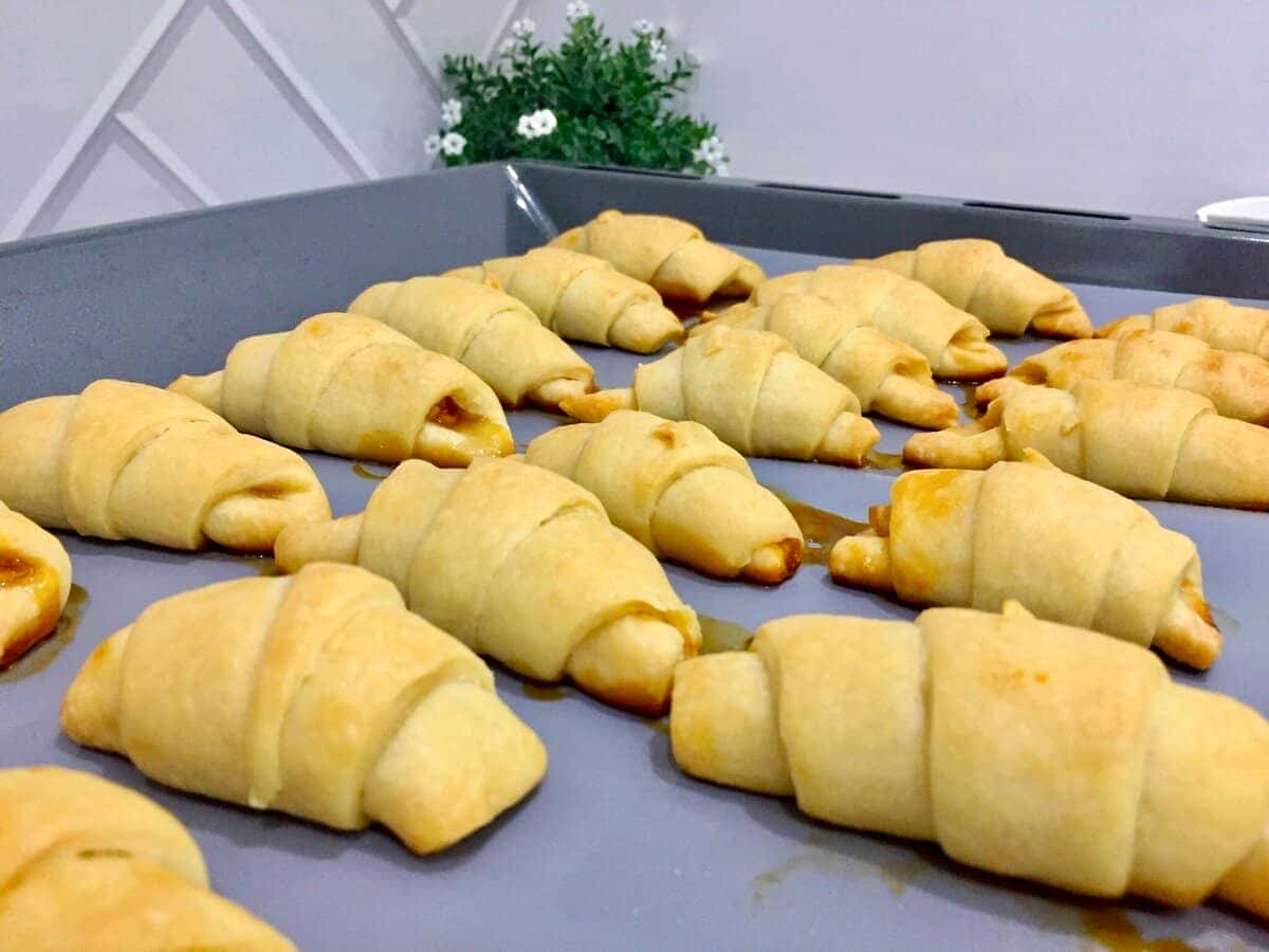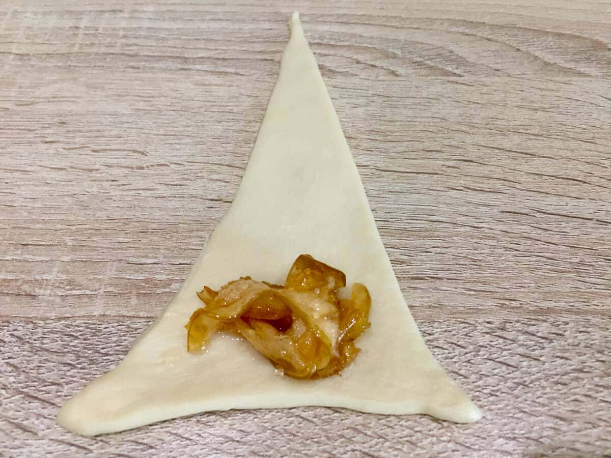 У кожен сегмент-трикутник загортаємо начинку: кладемо її на підставу трикутника. Для начинки беремо мармелад, шматочки фруктів з варення, джем ( на вибір і за смаком ). Головне, начинка не повинна бути рідкою або водянистою.