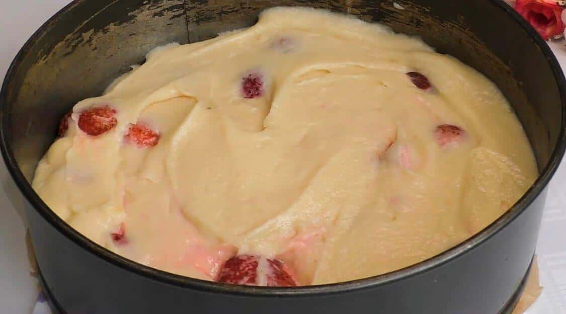 Полуницю посипаємо борошном, перемішуємо. Всипаємо в тісто і добре змішуємо.