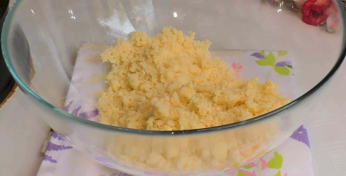 У чисту миску всипаємо борошно, цукор, вершкове масло і перетираємо в крихту.