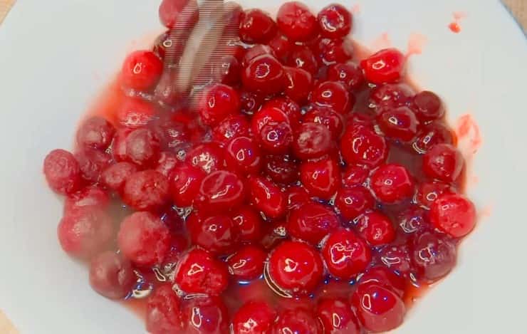 Заливаємо гарячим сиропом заморожену вишню і залишаємо повністю розморозитися, можна це зробити напередодні.