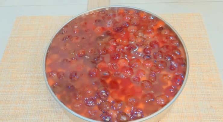 “Желе для торта” розвести за інструкцією на упаковці. Розводимо вишневим сиропом, який вийшов при розморожуванні вишні навпіл із водою, щоб надати відтінку.