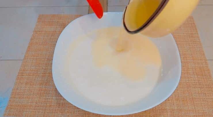 Просіюючи, підсипаємо суху суміш до яєчної, акуратно вимішуючи. Тісто виходить рідким, легко стікає з лопатки.