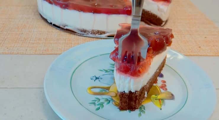 Дуже ніжний та смачний віденський пиріг з вишнею, я б навіть назвала його тортом. Він поєднує в собі контраст смаків та шарів: основа з шоколадного бісквітного коржа, середина з сирно-сметанного шару та верх із кислуватої вишні та желе. Замість вишні можна використовувати будь-які інші ягоди чи фрукти.