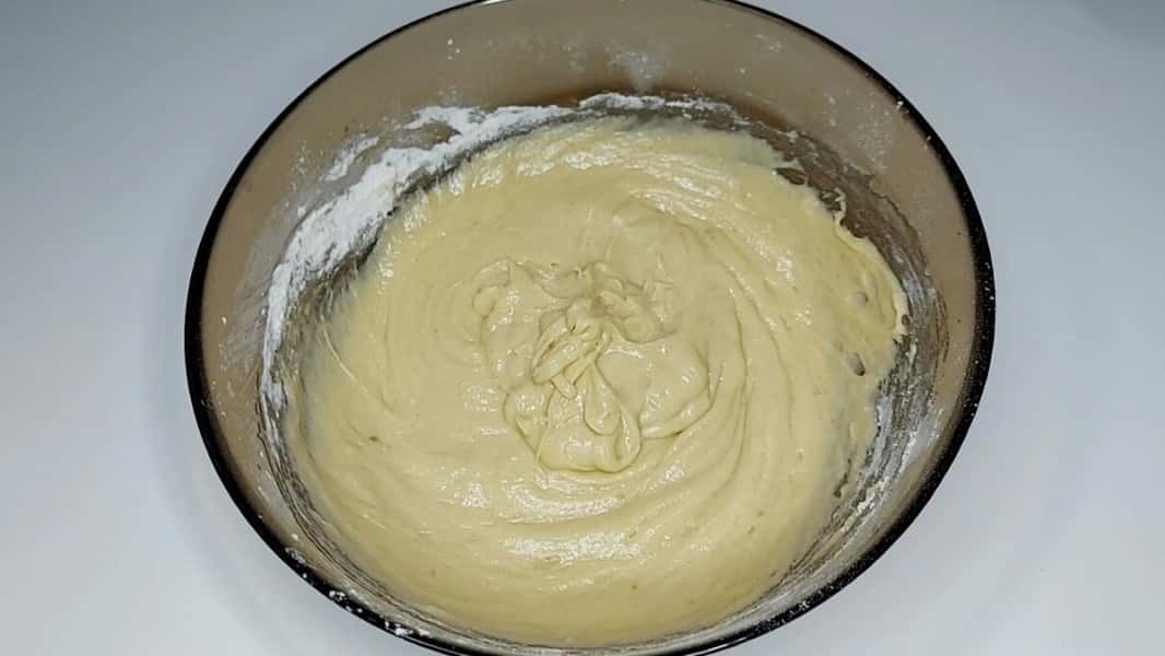 3. Після, поступово додаючи просіяне борошно з розпушувачем, замісити м’яке тісто, яке не липне до рук. Цього разу я використовувала борошно загального призначення. Результат такий самий, як і з пшеничним борошном вищого ґатунку, тільки тісто трохи темніше. Накрити харчовим пакетом і відправити в холодильник, поки готується начинка.