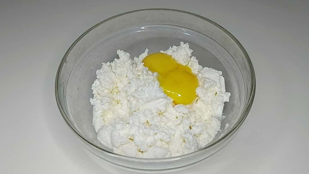 4. Для начинки в окремій мисці змішати вилкою сир із двома жовтками, ванільним цукром, сметаною, цукровою пудрою та крохмалем.
