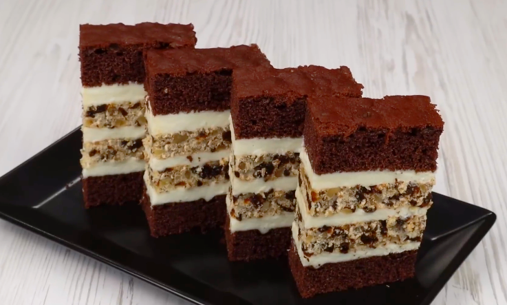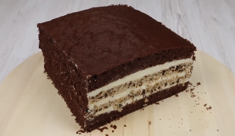 2. Складати пляцок у послідовності: шоколадний корж – 1/3 крему – корж з горіхами та чорносливом – 1/3 крему – корж з горіхами та чорносливом – 1/3 крему – шоколадний корж.