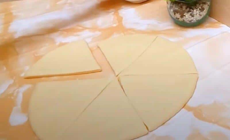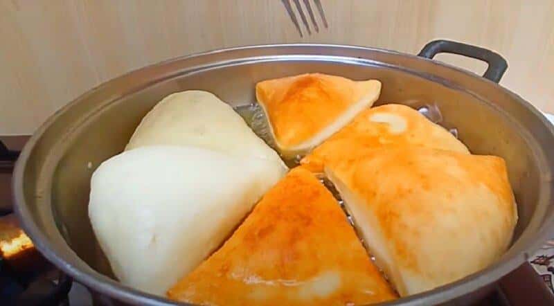Тісто поділяємо на кілька частин, розкачуємо кожну в коло і розрізаємо на 6 рівних трикутних сегментів. На кожен пиріжок потрібно по 2 таких сегмента. Складаємо їх по 2, защипуємо краї з двох сторін, утворюючи кульок, в який укладаємо начинку. Захипуємо вільний край і відразу ж відправляємо на сковороду з прогрітою олією.