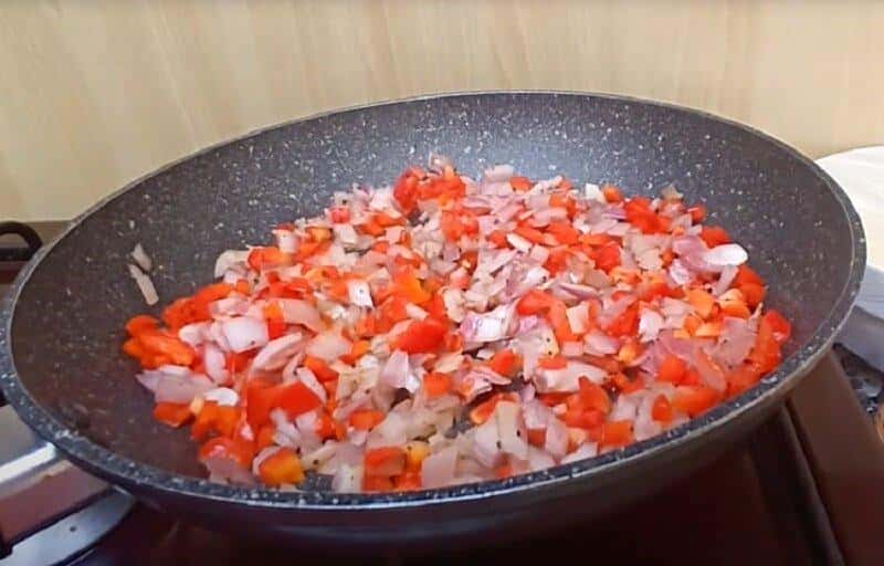 Дрібно нарізаємо цибулю, солодкий перець і обсмажуємо їх, додавши трохи олії. Обсмажуємо до готовності.