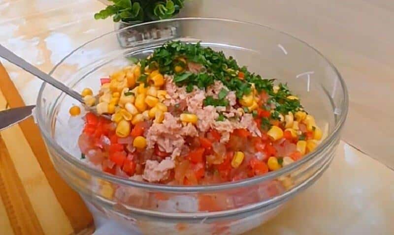 Для начинки візьмемо консервовану рибу – 200 грам, консервовану кукурудзу – 150 грам, половинку солодкого болгарського перцю, твердий сир – 200 грам, а також невелику цибулину і зелень петрушки.