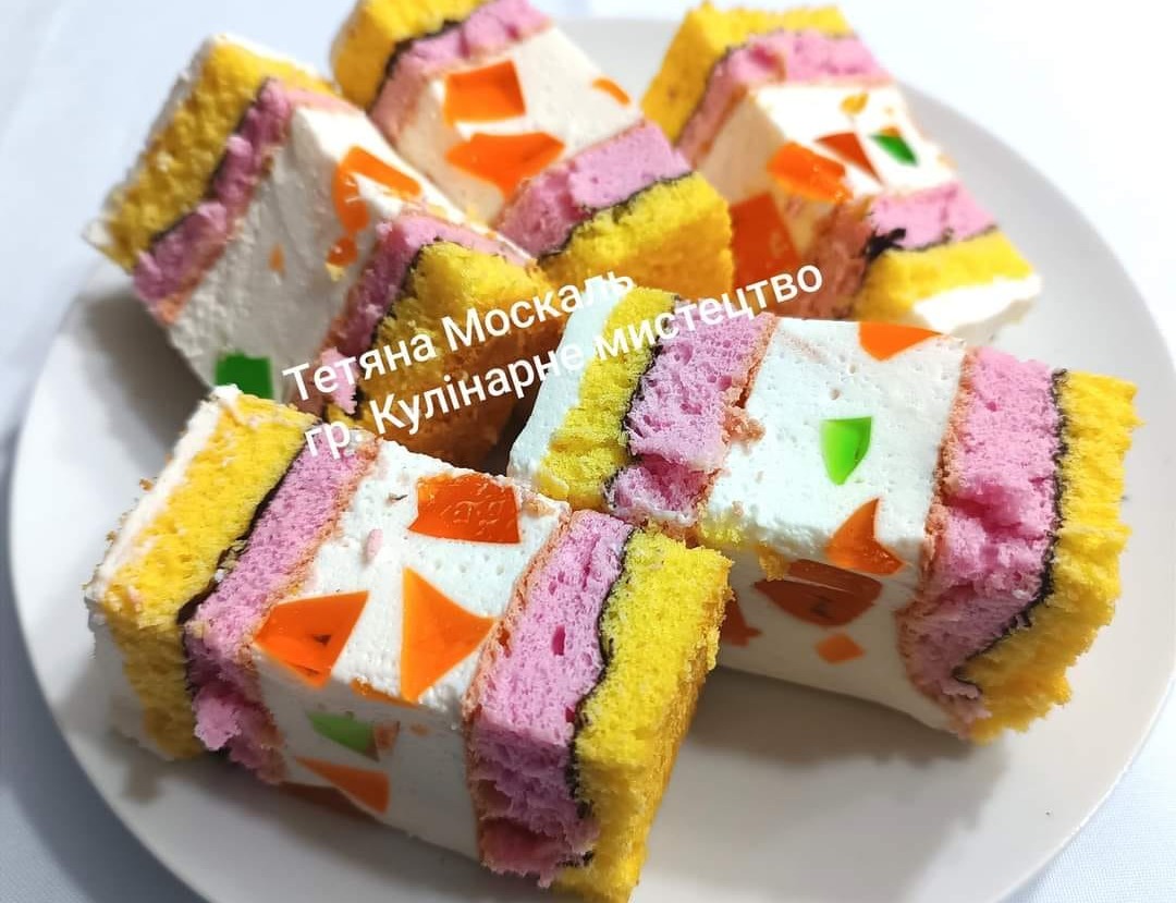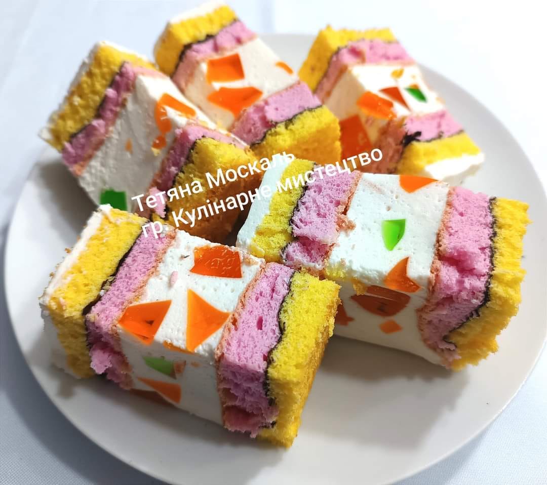 Додати кубиками желе (1 п желе+180 мл води, розігріти і поставити , щоб повністю застигло)