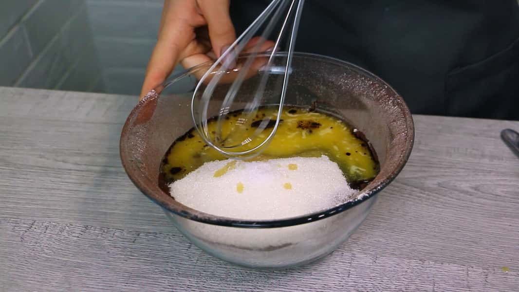 Всипаємо 150 г цукру, додаємо щіпку солі, вливаємо 100 г розтопленого вершкового масла. Трохи перемішаємо.