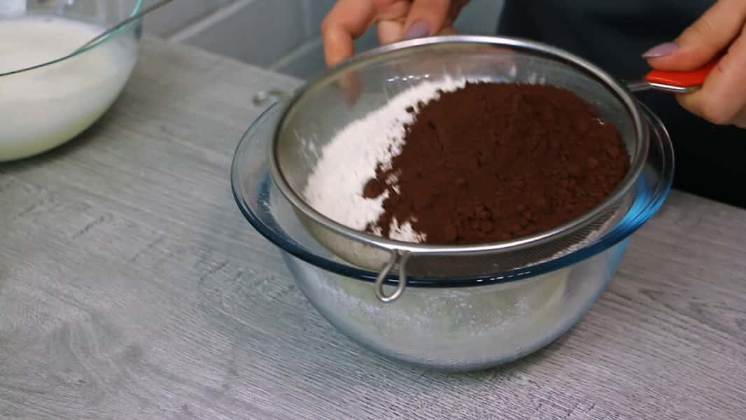 В окремій мисці просіюємо 330 г борошна та 50 г какао (у мене алкалізоване).
