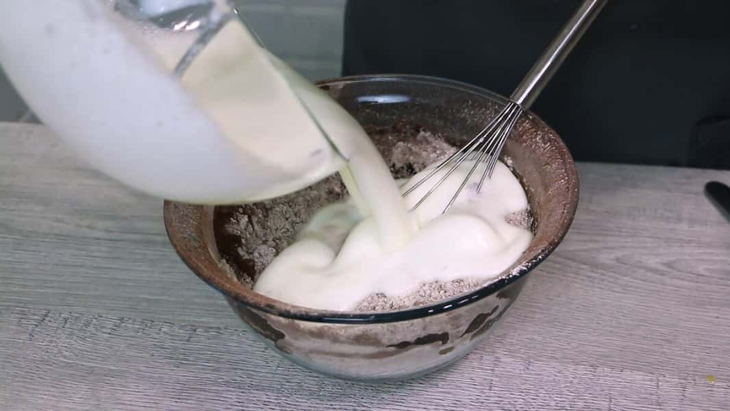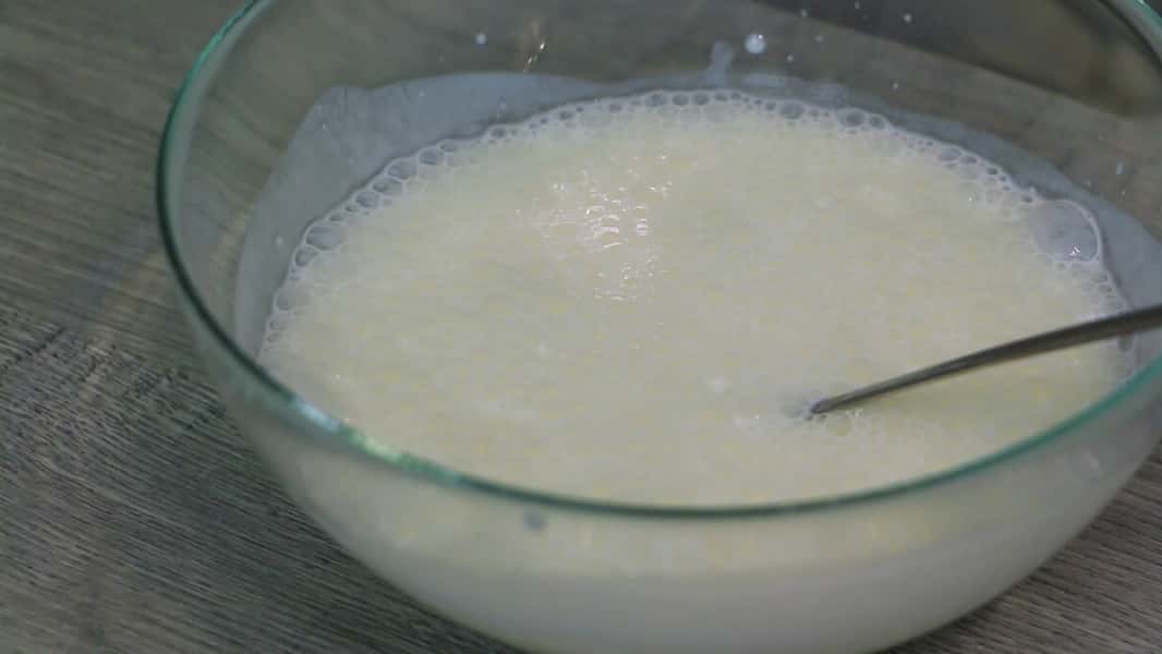 Для початку нам необхідно змішати 300 мл теплого кефіру з 1 ч. л. соди. Повинна піти реакція та з’явитися багато бульбашок.