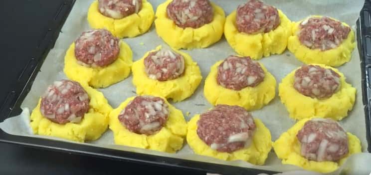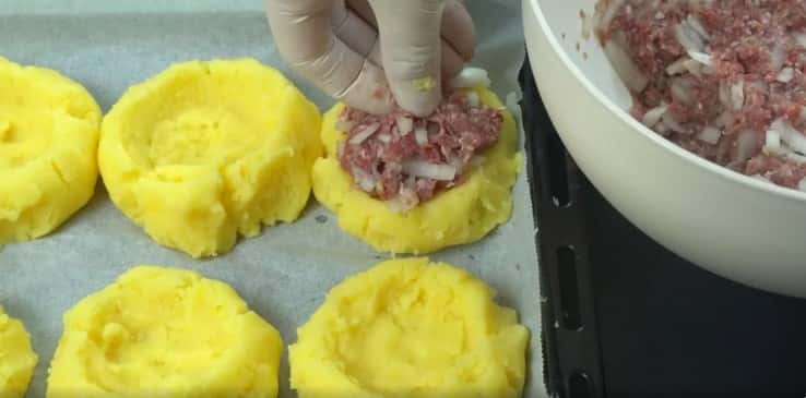 - Начинку з фаршу потрібно викласти на кожен картопляний коржик.