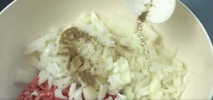 - В окрему миску потрібно викласти яловичий фарш і змішати його з цибулею нарізаною дрібно.