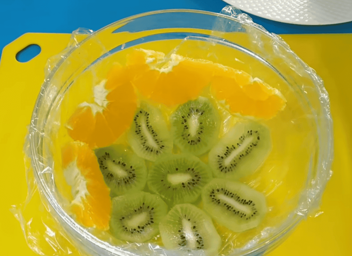 Накриваємо плівкою та відправляємо в холодильник до повного застигання фруктово-желейного десерту.