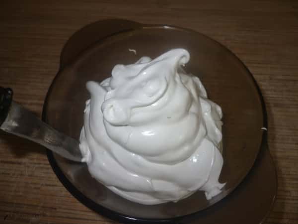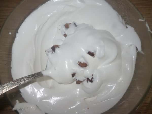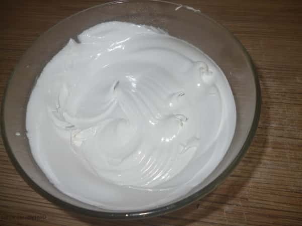 Беремо міксер, до білків додаємо крихітну дрібку солі і починаємо збивати їх. Потроху додаємо цукор з підмішаним до нього ваніліном.