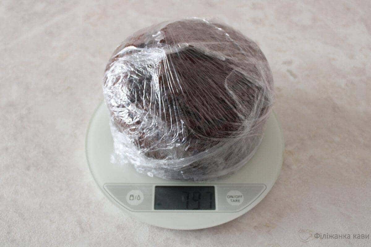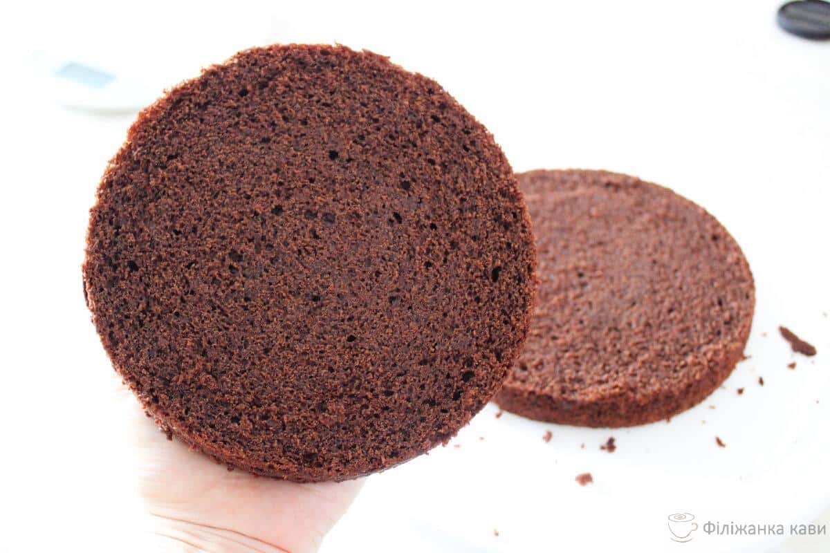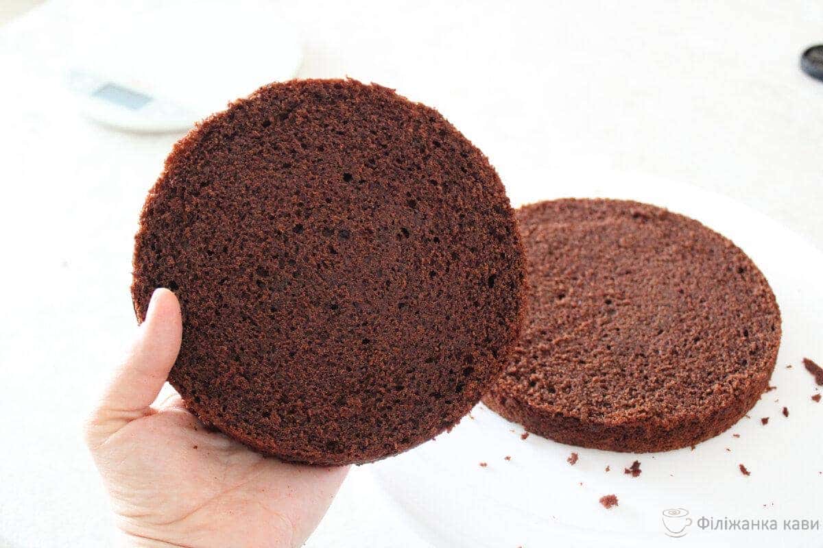 Коли бісквіт вже майже охолов його можна виймати з форми і обертати харчовою плівкою. У такому вигляді він повинен провести в холодильнику не менше 8 годин. Завдяки цьому волога по бісквіту розподілиться рівномірно і його буде легко нарізати на коржі, буде менше крихт.