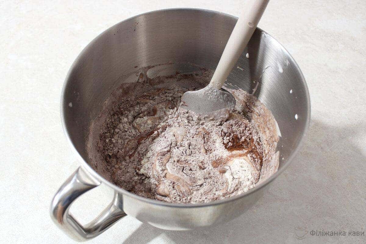 Через сито додаємо сухі інгредієнти і перемішуємо тісто.