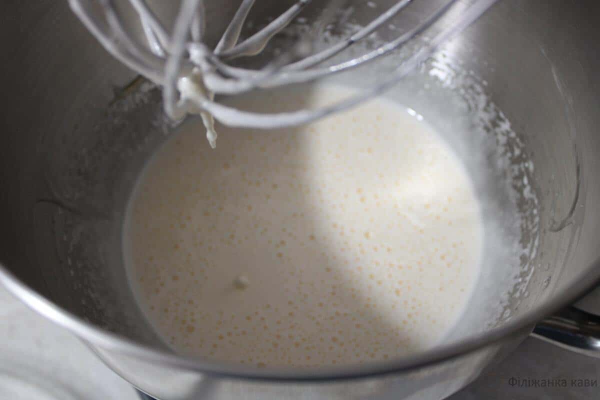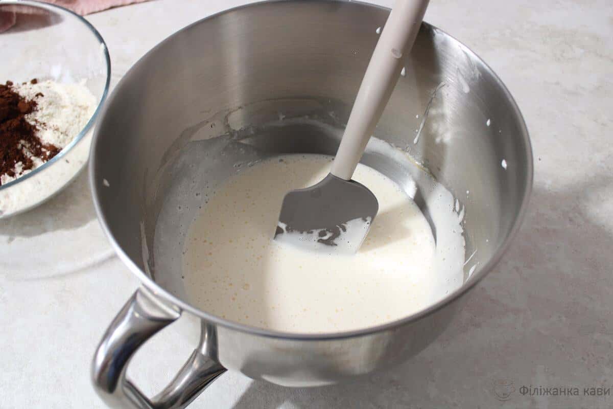 Коли яйця добре збиті додаємо до них олію і молоко кімнатної температури. Добре перемішуємо.