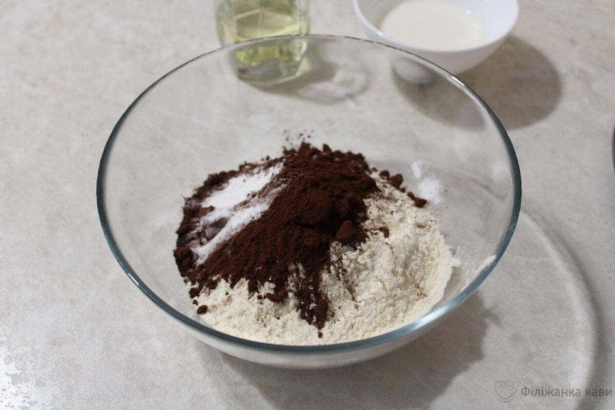 У чашу відміряємо потрібна кількість борошна, какао і розпушувача. Какао обов’язково використовуємо алколізоване. Таке какао не йде ні в яке порівняння з тим какао, що продається в супермаркетах. Завдяки йому будь-яка випічка набуває насичений смак і аромат шоколаду.