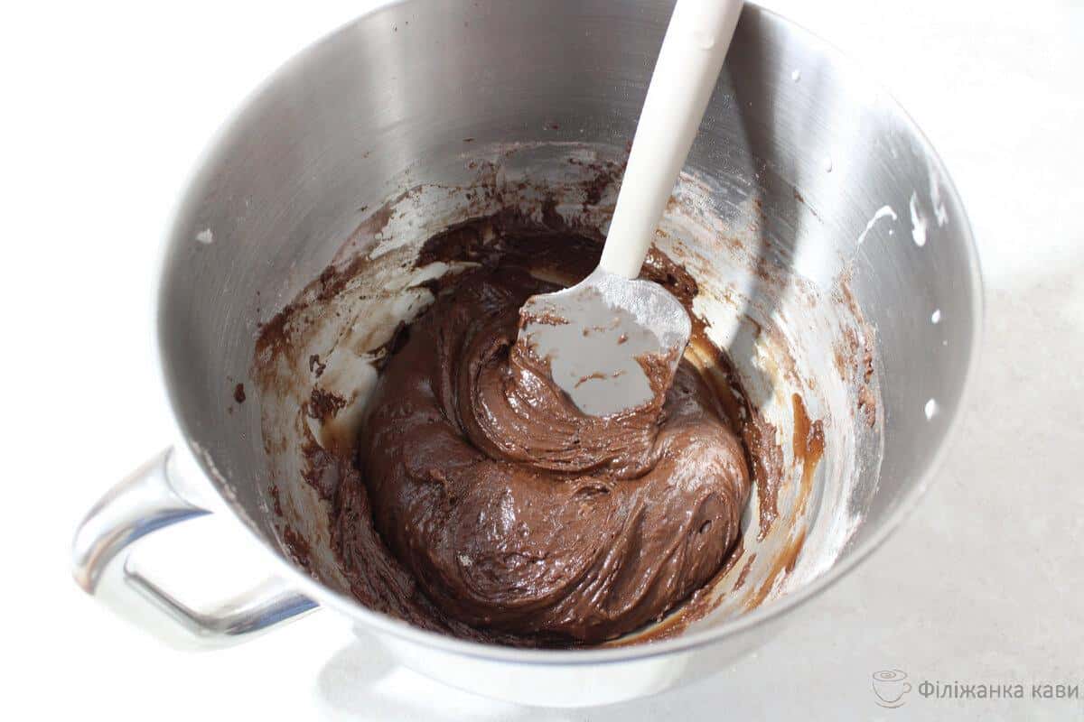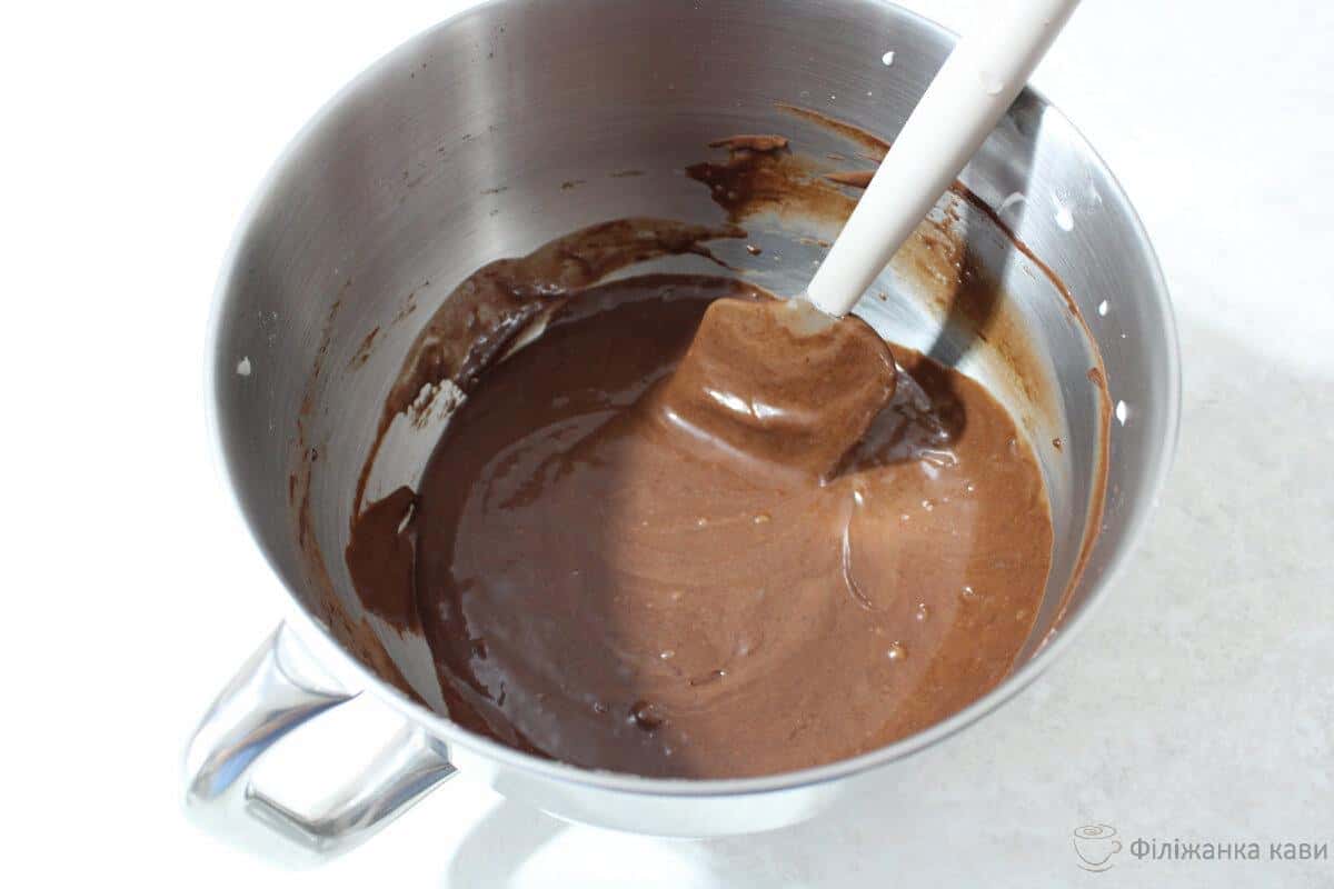 Промішане тісто виходить досить густим, залишається додати останній інгредієнт. Це крутий окріп. Саме він допомагає какао заваритися і проявити себе більш яскраво.