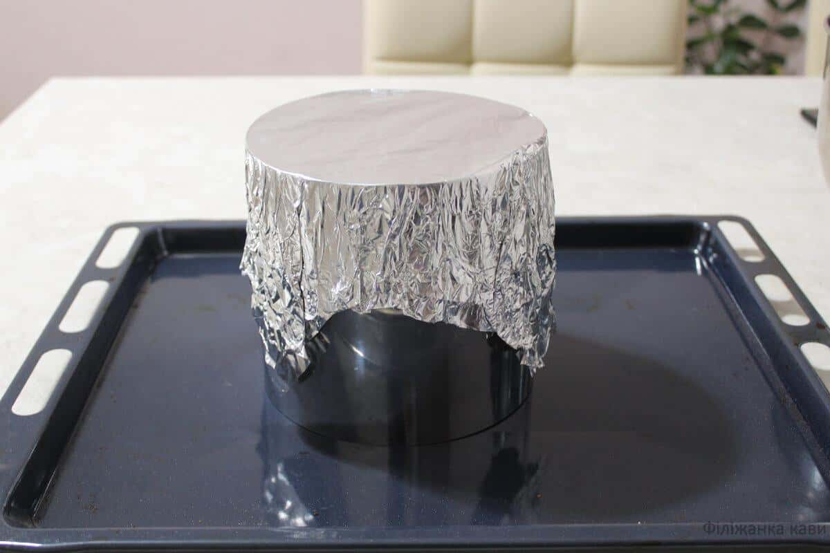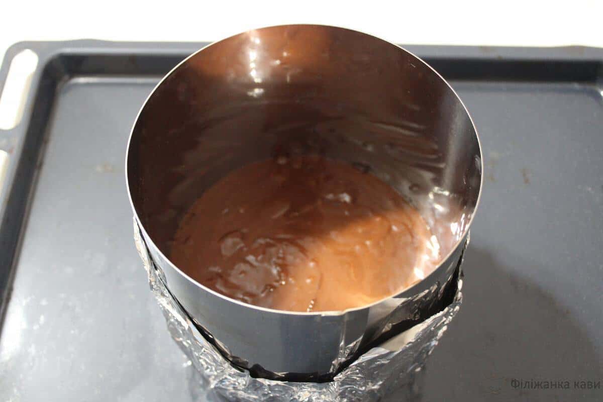 До цього моменту вже повинна бути розігріта духовки і готова форма для випічки. Я використовую кондитерське кільце діаметром 16 см дно, якого устелене фольгою.