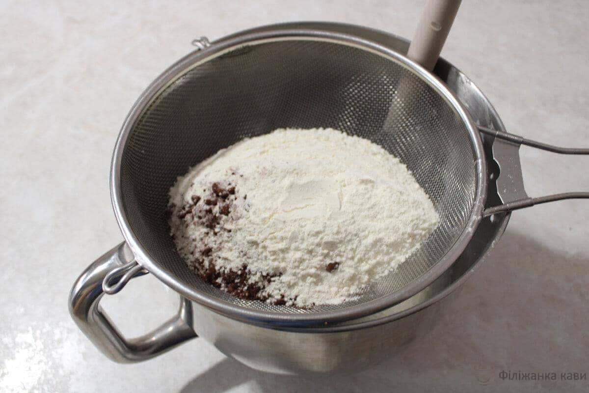 Цей етап пропускати не можна, тому як какао може комковаться і в готовому бісквіті будуть потрапляти дрібні не промішані грудочки, що не дуже приємно.