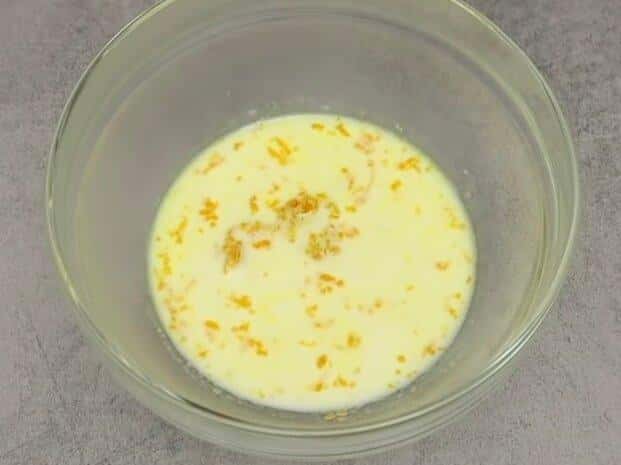 У миску додаємо подрібнену цедру апельсина, вливаємо гаряче молоко і залишаємо трохи постояти.