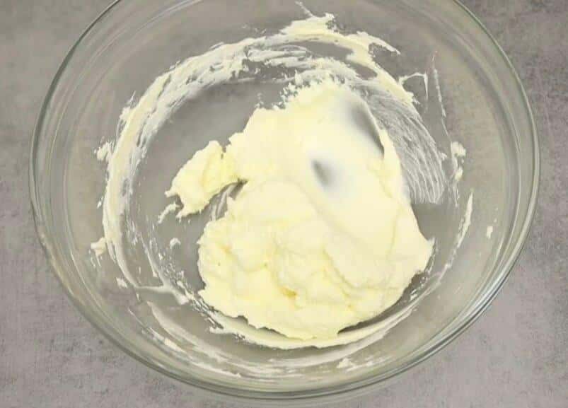 У глибоку чисту миску викладаємо вершковий сир (Філадельфія), м’яке вершкове масло і добре все змішуємо лопаткою.