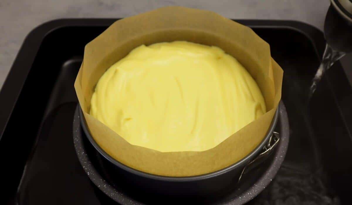 Беремо форму 18 сантиметрів, ставимо її на деко високе, постилаємо пергамент з бортиками і вливаємо підготовлену масу. У деко наливаємо гарячу воду. Випікаємо 30 хвилин, при температурі 150 градусів. Потім 30 хвилин, при температурі 110 градусів.