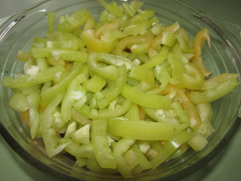 Перець необхідно розрізати на частини, а потім на брусочки. Можна брати овочі будь-якого кольору, просто жовті чи зелені перчини будуть гарнішими.