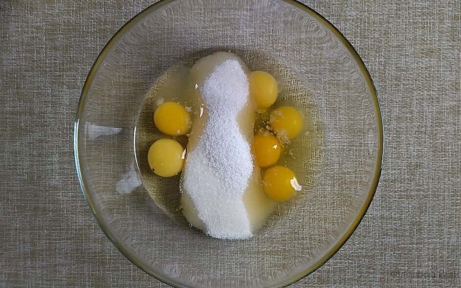 У мисці для замісу тіста з’єднати яйця, сіль, цукор, ванільний цукор.