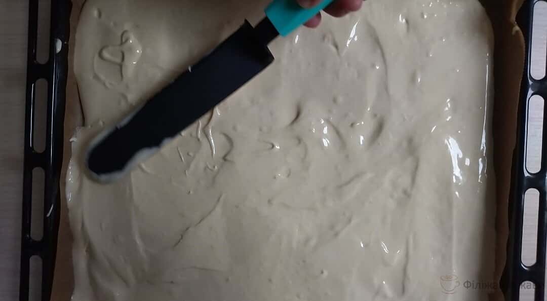 На деко, застелене пергаментним папером, перекласти готове тісто і розрівняти.