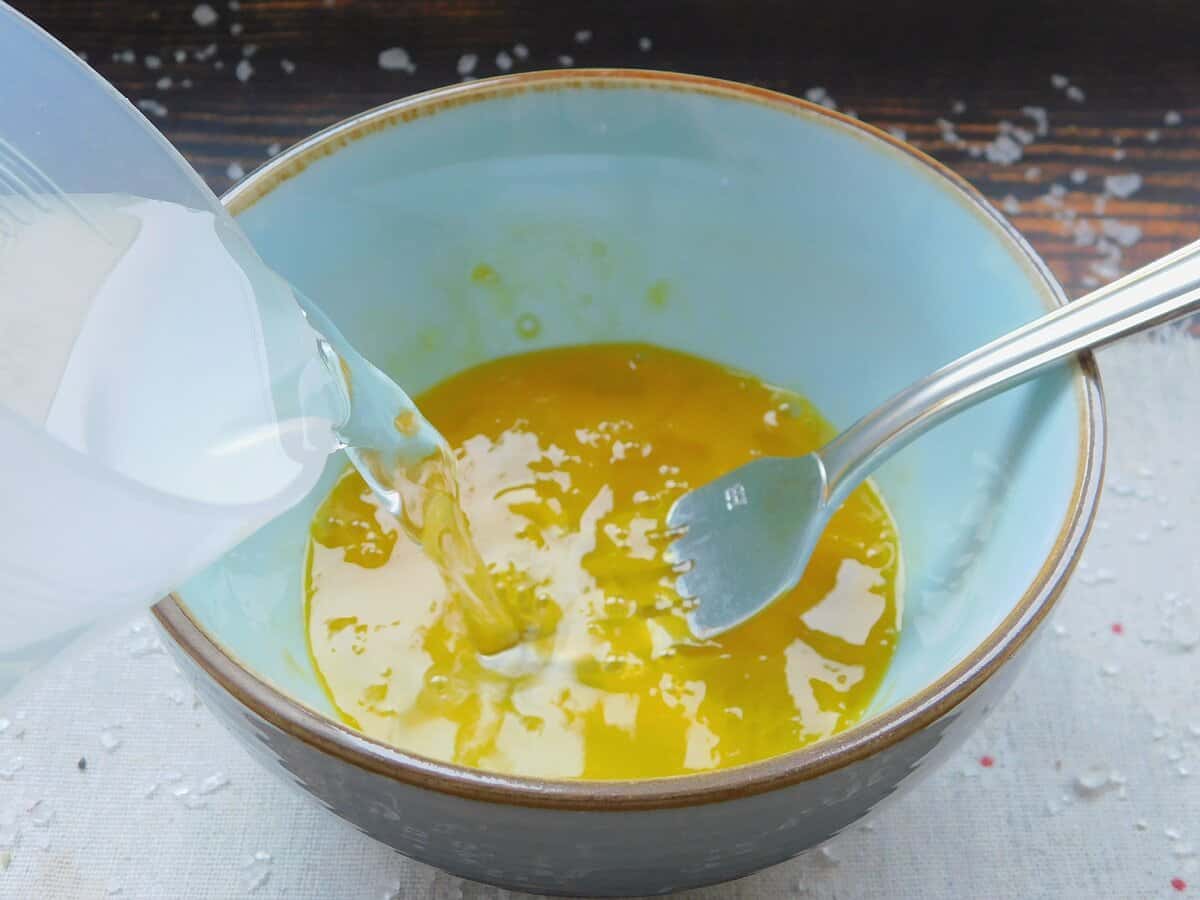 1. Для тіста в кухоль або піалу розбити яйце, додати сіль.