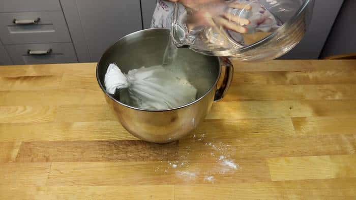 Зав’язую і кладу в велику миску або каструлю. Заливаю водою, температура води 20-21 градус.