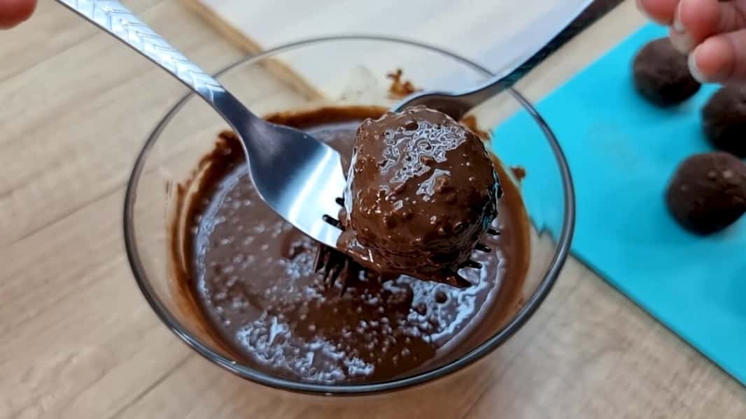 Дістати з морозильної камери застиглі кульки і кожну кульку занурити в шоколадно-горіхову масу. Викласти кульки на дошку, покриту пергаментом та помістити в холодильник до застигання