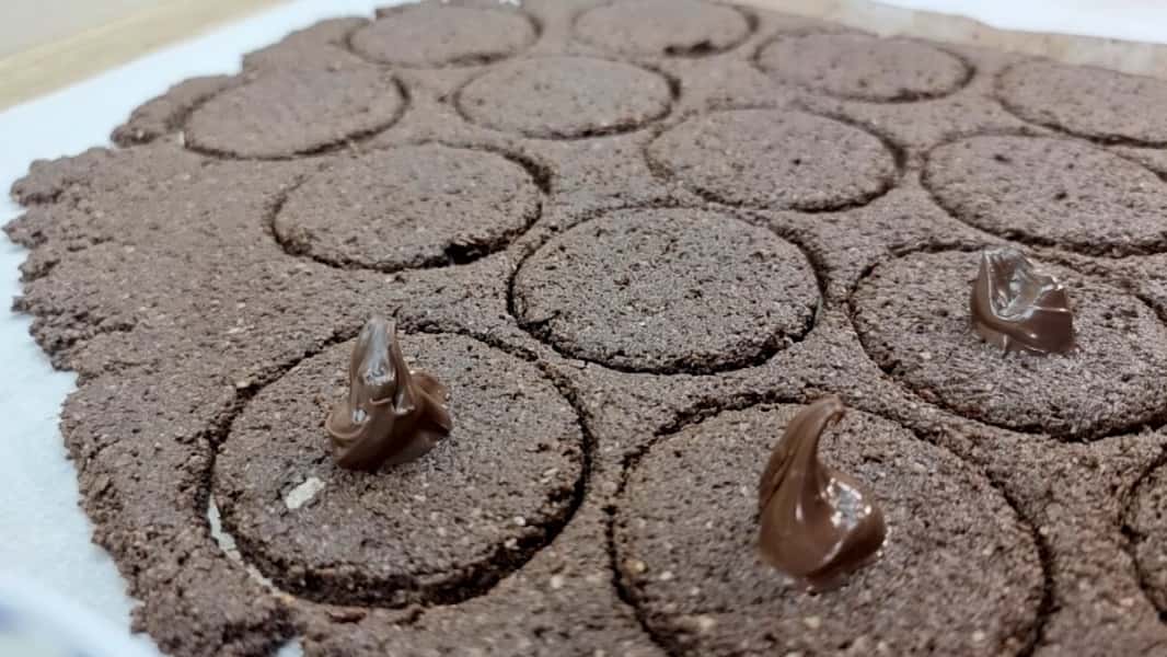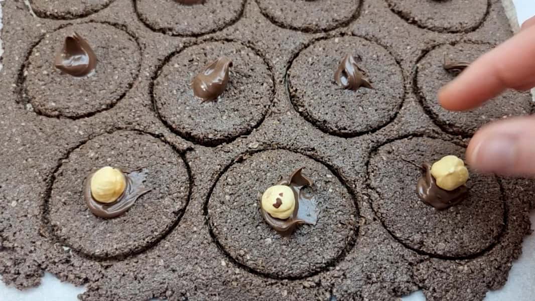 На цьому пласті формочкою для тіста видавити кружечки. У центр кожного кружечка покласти трохи шоколадної пасти та на неї ядро горіха