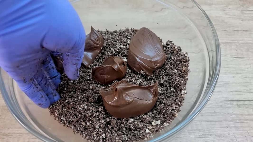 До вафельної крихти додати шоколадну пасту і добре перемішати рукою. Повинна вийти така тістоподібна маса