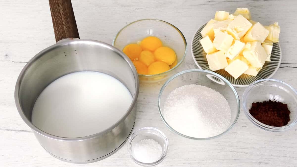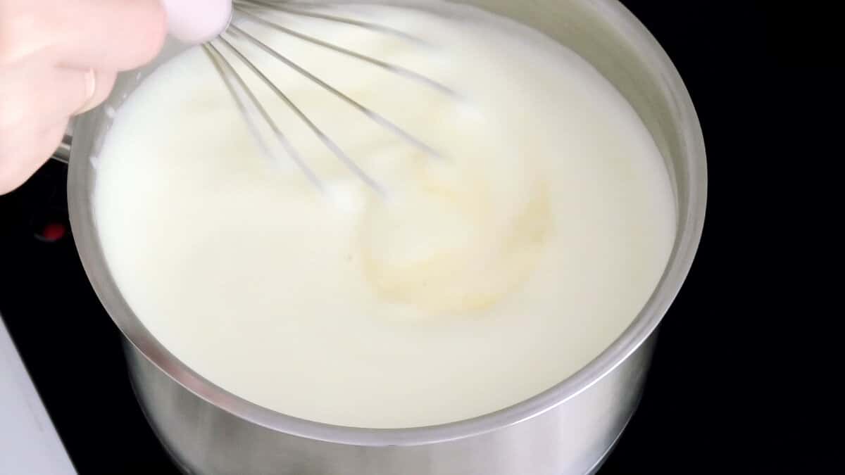 У сотейник налити молоко, додати цукор, ванільний цукор і жовтки. Ретельно перемішати вінчиком і поставити на вогонь.