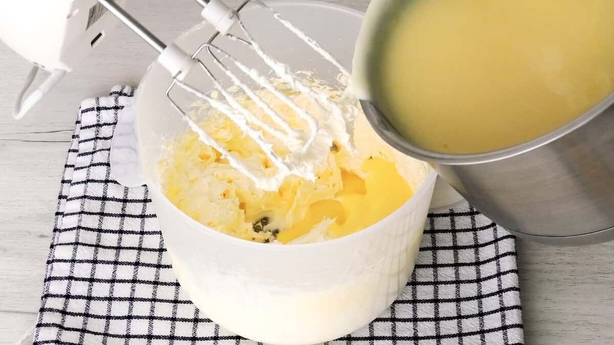 І потроху вливаючи сироп продовжити збивати крем. При цьому і масло і сироп повинні бути однієї температури, щоб крем не розшарувався.