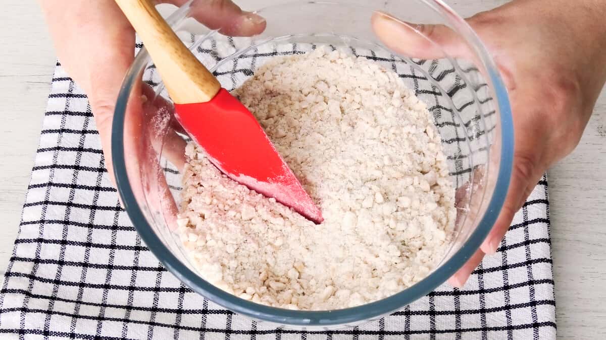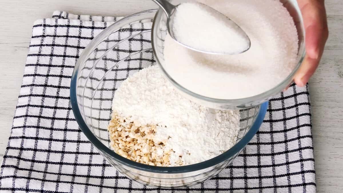 Окремо з’єднати перемелені горіхи, борошно і 2 столові ложки цукру від загальної кількості.
