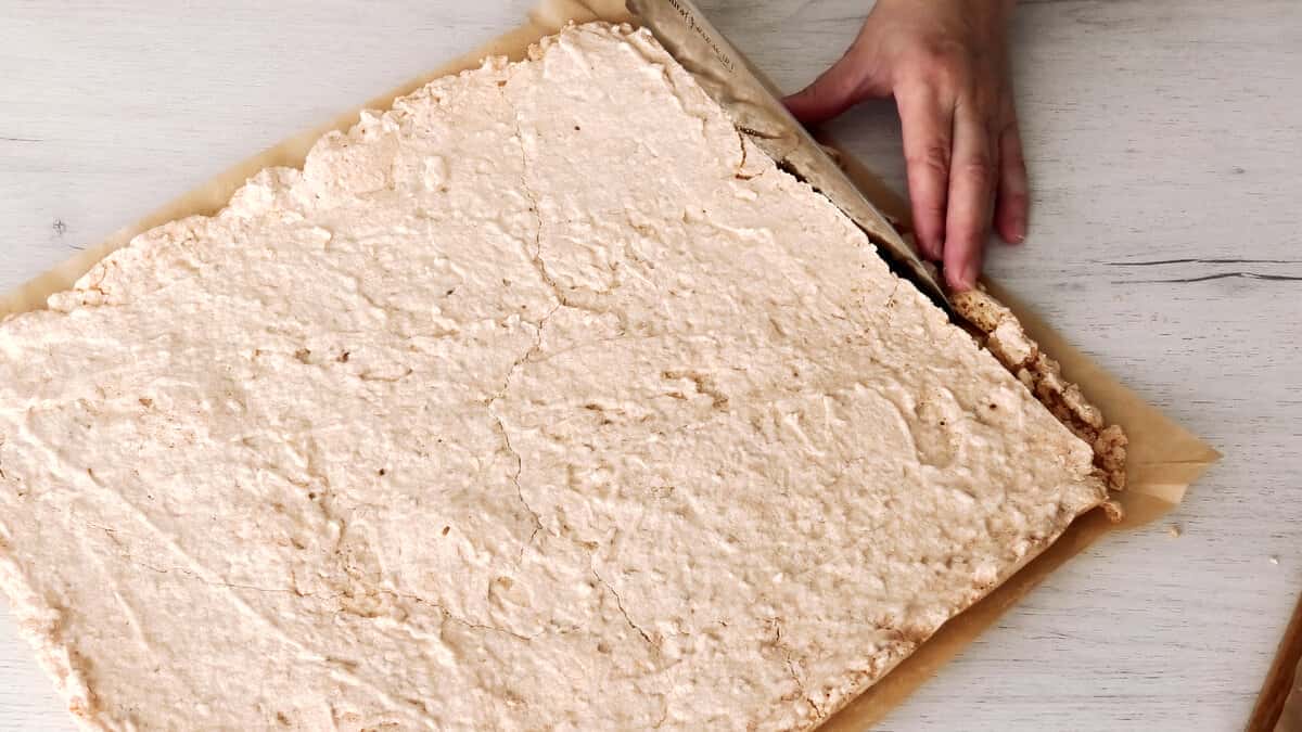 Готовий корж остудити на решітці, а потім підрівняти краї.