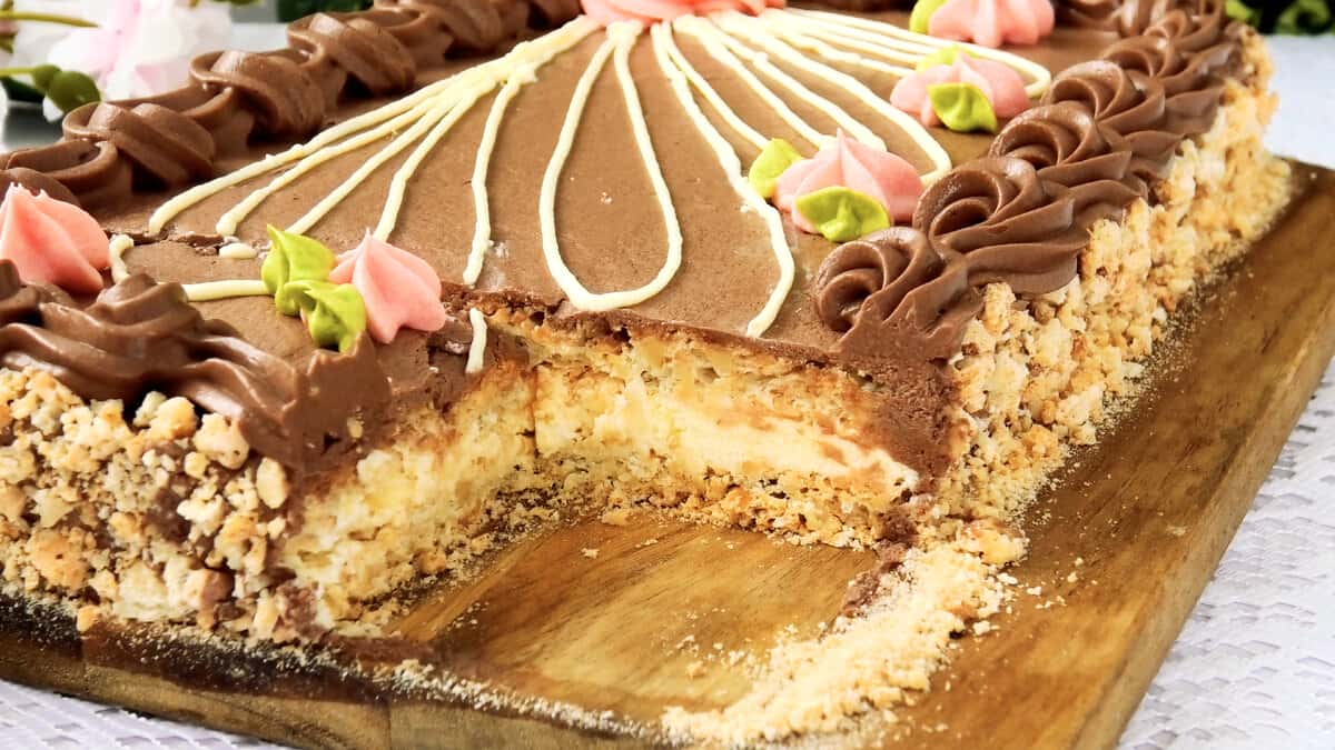 У перший день торт хрусткий, а ось простоявши ніч в холодильнику став м’якше і різався вже краще, але в будь-якому варіанті мені він дуже сподобався!
