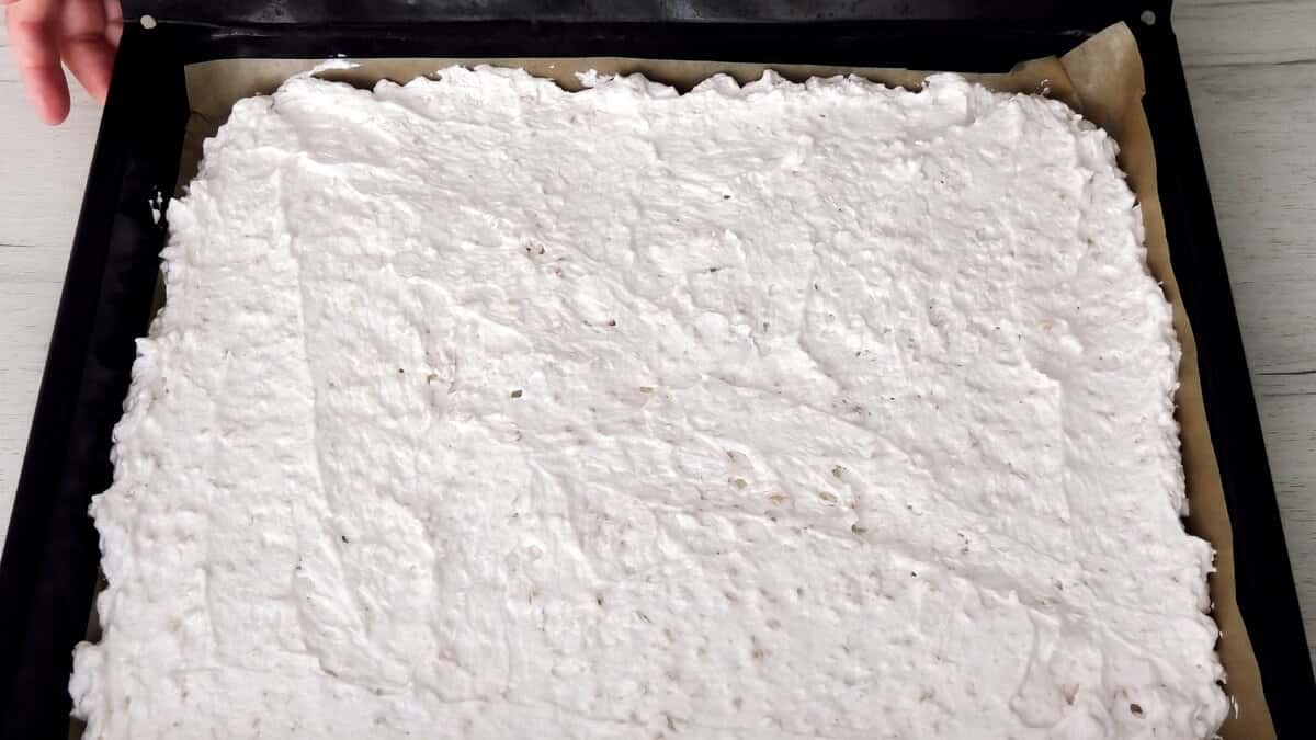 Викласти всю масу на деко застелене пергаментом і розрівняти.