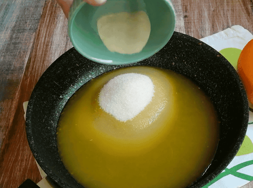 У сотейнику або сковорді з товстим дном з’єднаємо апельсиновий сік, цукор та агар-агар. Добре розмішаємо лопаткою, щоб не було грудочок і поки що відставимо вбік.