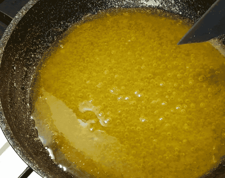 Ставимо сковороду на середній вогонь і доводимо до активного кипіння, постійно помішуючи. Після закипання варимо ще 6-7 хвилин, також постійно помішуючи. Агар-агар розчиняється лише за темератури 95-100°, тому активне кипіння необхідне. Суміш готова.